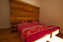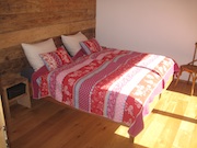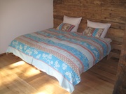 Massive oak bed 2x2 metres in a cosy room with a wall made of wood more than 200 years old. The bed has a wonderful eco mattress. Go through the Walkin Closet directly into the big bath room.